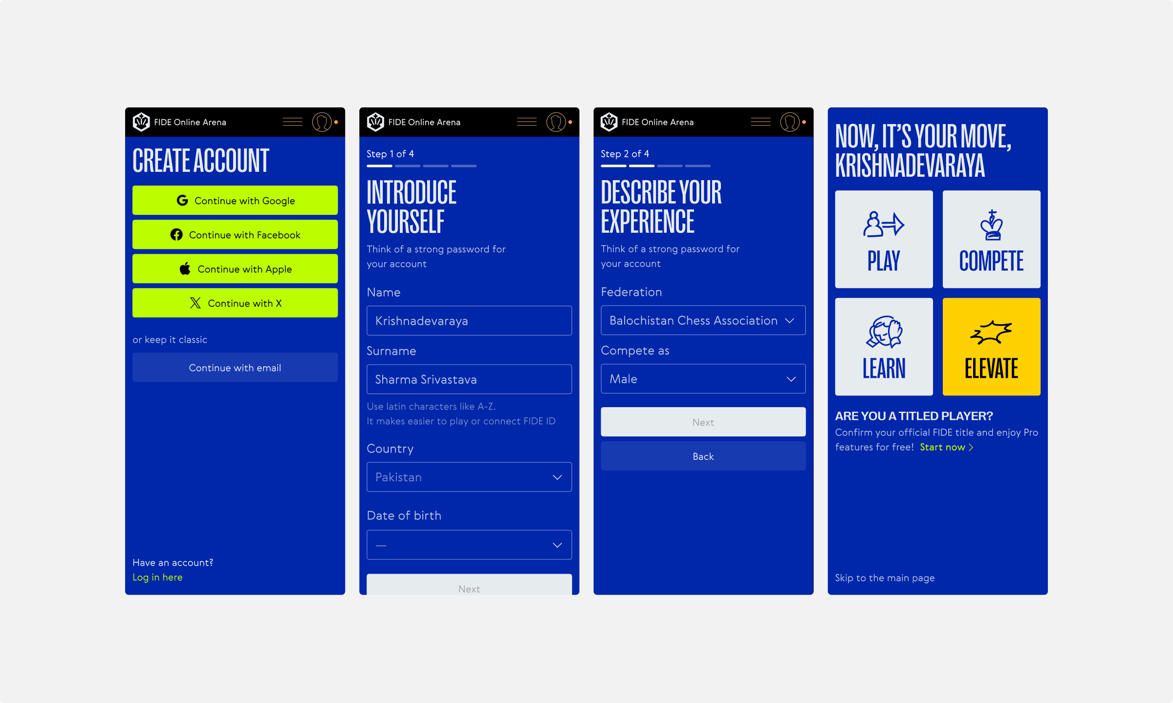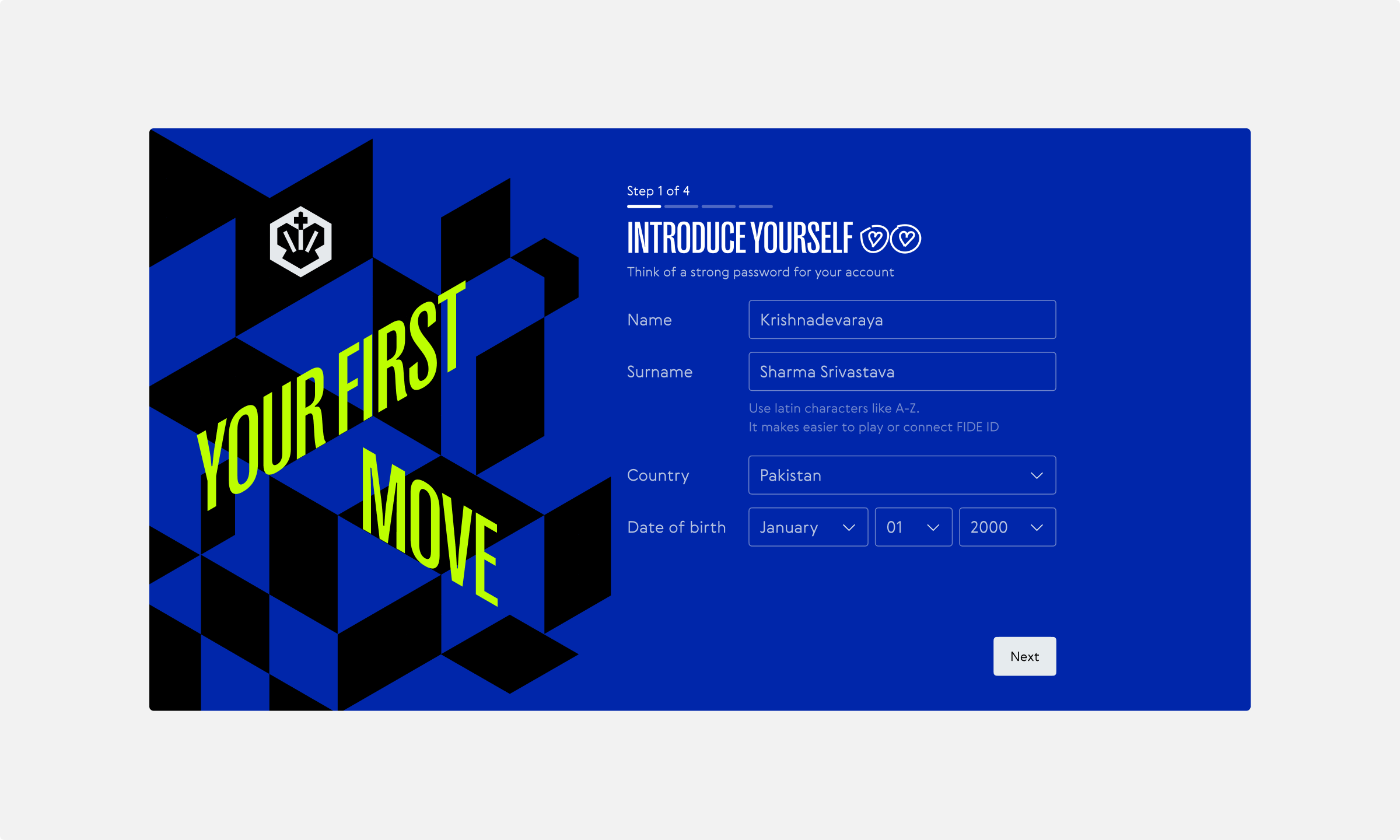 This new flow was designed as more than just a form. It was the entry point into a new version of World Chess. From the first screen, we wanted people to feel the change — something more open, more expressive, and more personal than they might expect from a chess platform. It wasn’t just about collecting data. It was about giving people a moment to introduce themselves and feel where they were heading.